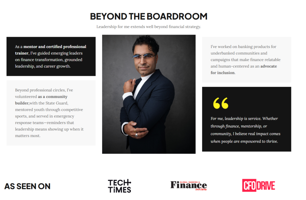 - Structuring the site to clearly communicate Rishi’s professional journey, leadership ethos, and fintech perspective